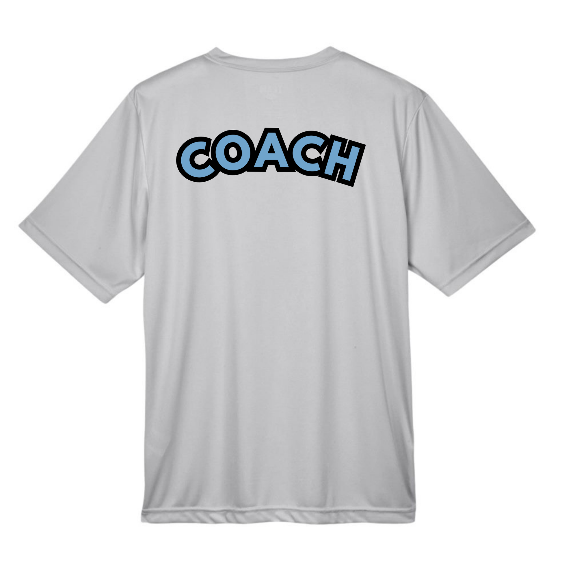90/10 Airlume combed and ring-spun cotton/polyester heather grey t-shirt with large center logo. Coaches shirts are 100% polyester, moisture wicking and include "COACH" design on the backside. Available in Adult, Youth, and Toddler sizes. Please see sizing charts below.
